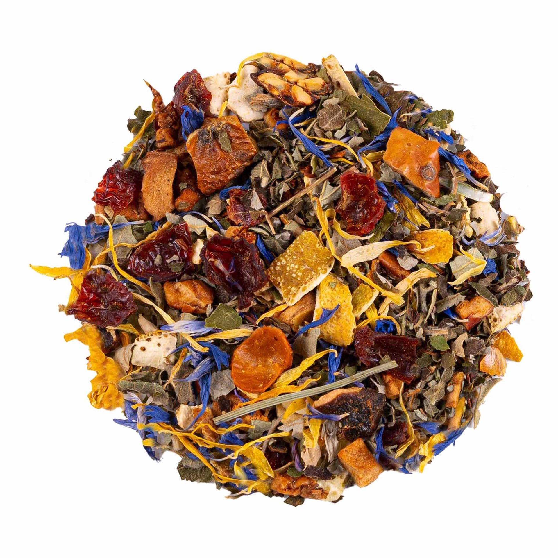 This splendid blend evokes the warmth and beauty of a perfect summer day, making each sip a moment of pure indulgence.Inspired by the golden warmth of the sun, Sun Herbs is a truly exquisite blend. The rich, earthy notes of Rooibos Super Grade form a perfect foundation, enhanced by the vibrant essence of apple, orange peels, and orange slices—each one capturing the brightness of a sun-drenched orchard. Rose hip and blackberry leaves lend a delicate, aromatic complexity, while a touch of natural orange flavouring adds a refined citrus allure.Blue cornflower and marigold petals swirl in, offering a visual feast as well as a soft floral finish.